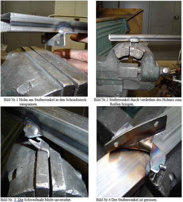 | 3.1 Allgemein Von jedem Fertigungslos hat der Werker, Einrichter oder zuständige Meister einen Holm pro Querschnitt mit angeschweißten Stufenwinkel zur Prüfung zu entnehmen. 3.2 Prüfungsvorbereitung • Holm über den angeschweißten Stufenwinkel in den Schraubstock einspannen. • Holm durch Verdrehen solange hin und her bewegen bis ein Bruch auftritt. 3.3 Prüfen und Dokumentieren: • Tritt der Bruch am Stufenwinkel auf, ist die Festigkeit der Schweißverbindung zum Holm gewährleistet und der Versuch als bestanden anzusehen. Die Holme können in die Fertigung einfließen. • Entsteht der Bruch an der Schweißnaht ist der Fertigungsprozess zu unterbrechen, der Meister zu informieren, und weitere Proben dem Los zur Überprüfung zu entnehmen. • Die Fehlerursache ist zu beheben. Z.B. Einstellungen am Schweißroboter überprüfen • Fehlerhafte Nähte sind manuell nachzuschweißen. • Ergebnisse müssen im FB Abreißversuche dokumentiert und durch Werker, Einrichter oder Meister und der QS unterschrieben sein. • Das Archevieren der vollen Formblätter erfolgt in der QS. |