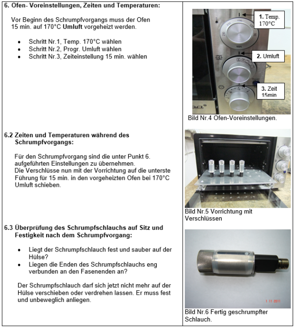 | • Ablängen des Schrumpfschlauchs • Montage des Schrumpfschlauchs auf den vormontierten Verschluss • Ofenvorrichtung mit Verschlüssen bestücken • Ofen- Voreinstellungen, Zeiten und Temperaturen • Zeiten und Temperaturen während des Schrumpfvorgangs • Überprüfung des Schrumpfschlauchs auf Sitz und Festigkeit nach dem Schrumpfvorgang |