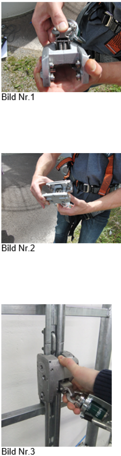 5.3 Den Fallschutzläufer auf die Schiene setzen und Auf- sowie Abwärtsbewegungen durchführen. Der Fallschutzläufer muss zudem über mindestens einen Fallschutzschienestoß geführt werden.