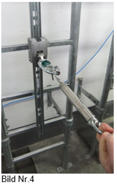 5.4 Jeder zehnte Fallschutzläufer des Typs 0529.74.00, 0529.74.30 und 0529.74.50 ist mit einer Federwaage auf die horizontale Auslösekraft zu prüfen. Der Prüfschritt ist auf der Fallschutzschiene ST/tZn durchzuführen.