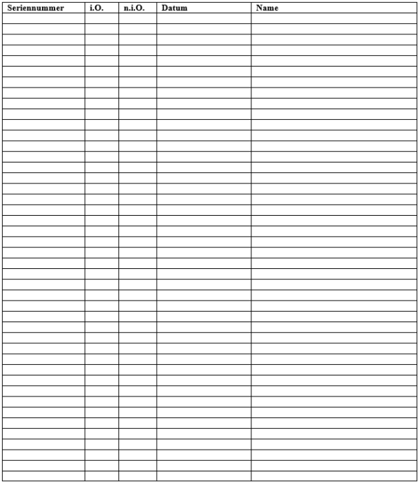 | Oben genannte Funktionsprüfungen müssen durchgeführt, und unten in der Tabelle festgehalten werden. Jede Steuerung bekommt eine Seriennummer, diese ist schon auf dem Aufklebebogen angedruckt. Die Steuerungen werden verpackt und zu jeder Steuerung kommt eine MA mit Konfirmationserklärung. Für jeden Auftrag wird eine Neue Prüfanweisung zur Dokumentation ausgefüllt und anschließend bei QS abgelegt. |