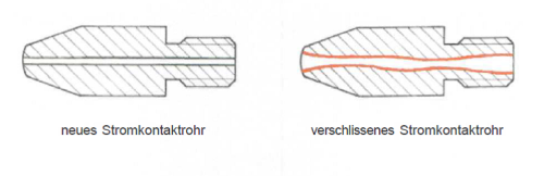 | Stromkontaktrohr | Stromkontaktrohr verschlissen | Erwärmung durch erhöhten elektrischen Widerstand, Lichtbogen brennt unruhig |