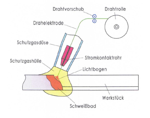 Beim MSG-Schweißen brennt der Lichtbogen zwischen einer abschmelzenden Drahtelektrode, die gleichzeitig den Zusatzwerkstoff liefert und dem Werkstück. Dabei wird die Drahtelektrode (grün dargestellt) über einen automatischen Drahtvorschub durch das Stromkontaktrohr hindurch der Schweißstelle zugeführt. Eine Schutzgashülle (gelb dargestellt) umgibt Schmelzbad und Drahtelektrode und verhindert so die Oxidation durch den Sauerstoff der Umgebungsluft. Das Metall - Schutzgasschweißen wird eingeteilt in das: