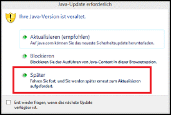 Sollte eine Frage nach einem Java Update erscheinen, muss hier der Punkt Später ausgewählt werden.
