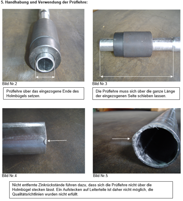 4.Beschreibung, Prüflehre- Holmbügel Ø 48,3mm. Die Prüflehre Ø 33,7mm ist im Aufbau und in der Handhabung identisch und wird aus diesen Grund nicht illustriert.