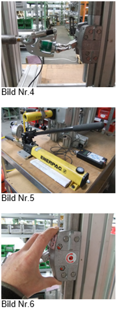 Die Zugkraft wird nun über die Hydraulikpumpe auf den Läufer ausgeübt (Bild Nr.5). Freilauf und Stopp des Läufers werden manuell mit der Hand abgefragt (Bild Nr.6). Die Werte über das Auslesegerät ermittelt.